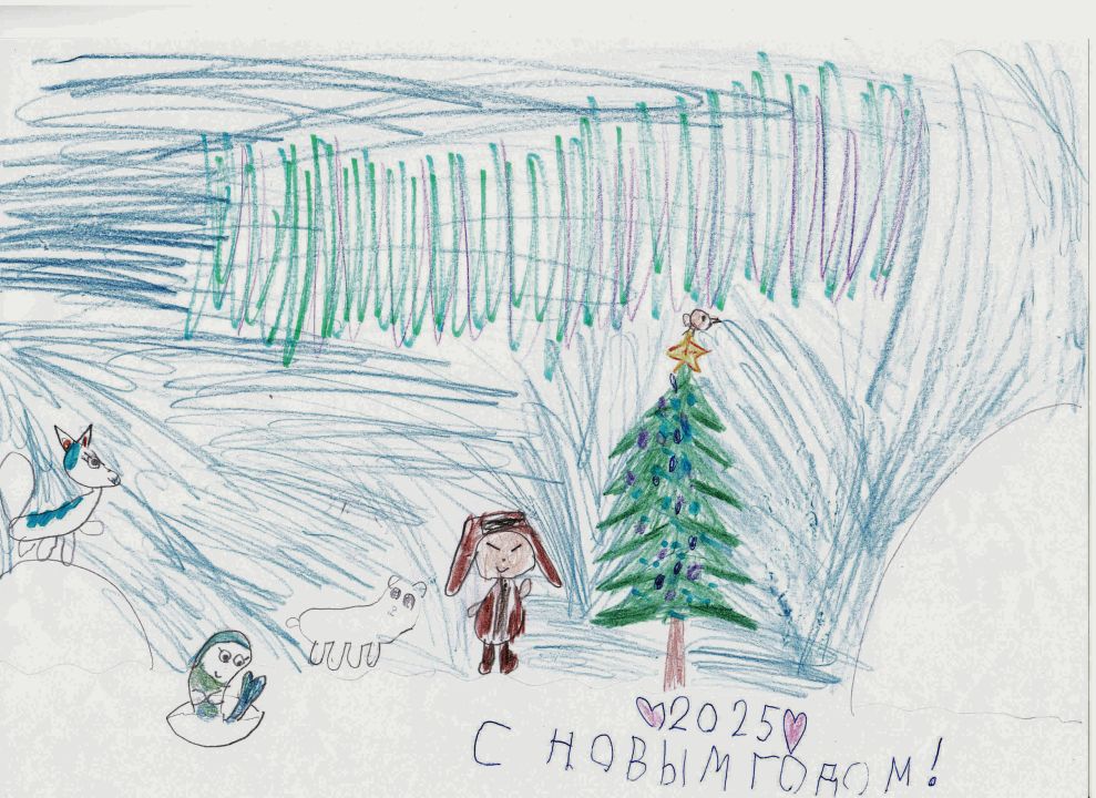 Работа нарисована карандашами моей дочерью Владой. Ей 7 лет и она очень любит мультфильмы про Умку и его друзей
