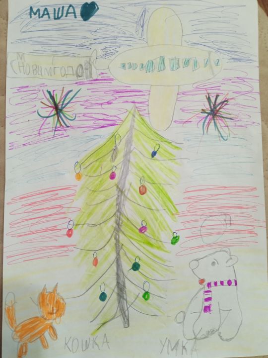 У Умки есть новая подружка - кошка. Они встретились возле Новогодней елочки и вместе смотрят фейерверк.