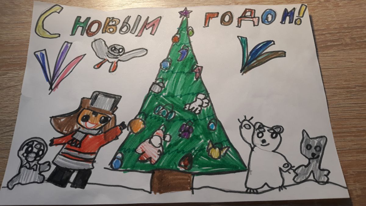 Умка решил на Новый год пригласить своих друзей. Они пришли и праздновали Новый год. Умка сказал: " Всех с Новым Годом!"