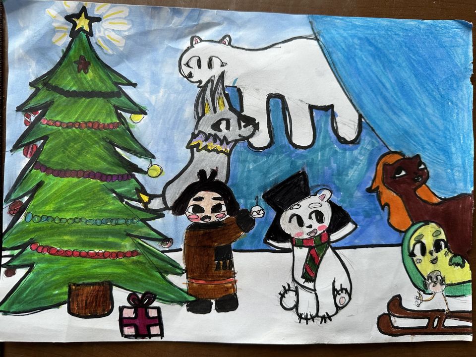 На моем рисунке Умка со своими друзьями в Новогоднюю ночь.