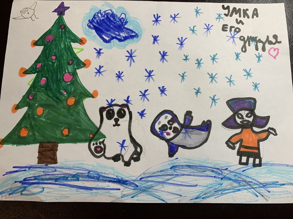 На моём рисунке нарисован Умка и его друзья. Они весело встречают новый год и ждут деда Мороза.