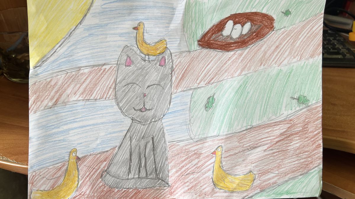 На картинке вы видите кота и птичек. На заднем плане можно заметить гнездо с яйцами. История этого рисунка такая: Кот гулял по лесу и заметил упал из гнезда и решает помочь, дальше они подружились!
