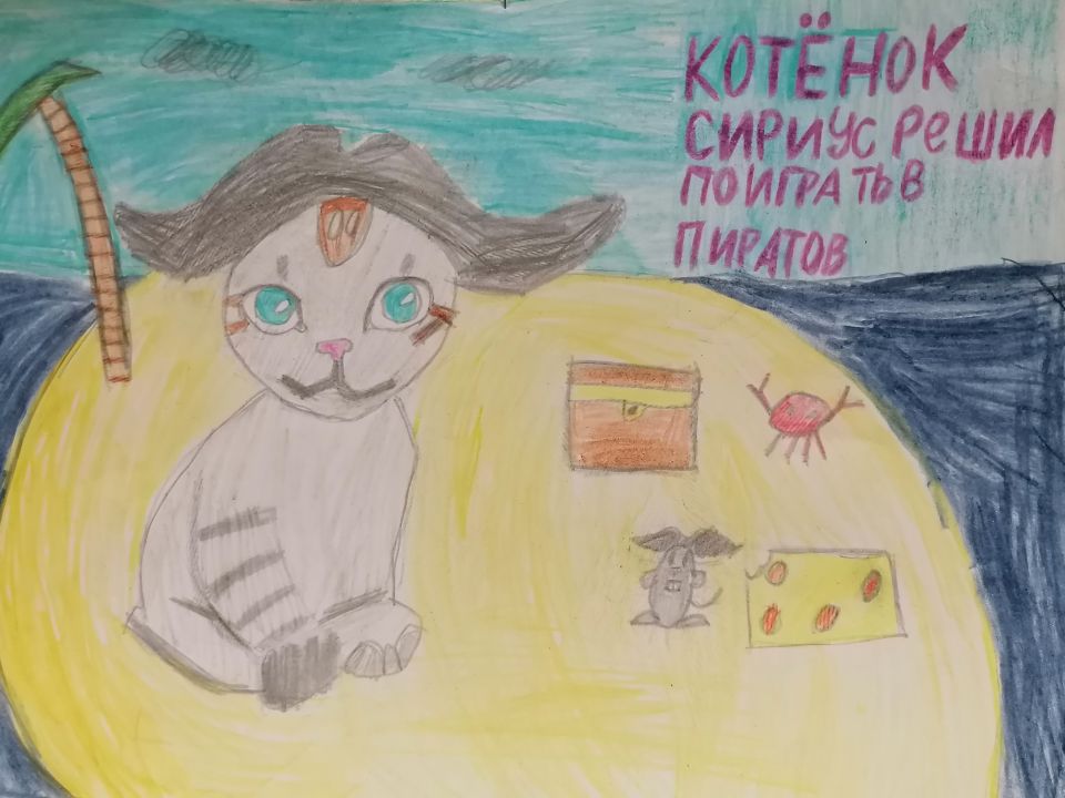 Про то, как котенок Сириус и мышонок Хвостик играли в пиратов. Попали на необитаемый остров. Они нашли клад и нового друга Краба Крабыча.