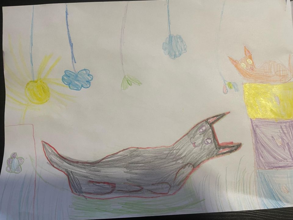 Здравствуйте, Меня зовут София, мне 7 лет Я нарисовала котика который лежит на лежанки и щенка который забрался на комод и играет в игрушку.