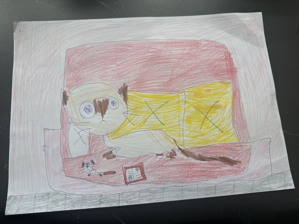 Котик очень любит сосисочки. И котенок тоже. Они много сосисок похитили и скушали. Теперь лежат на диване, делают вид, что читают, что не они сосисочки скушали