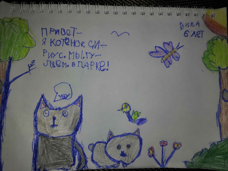 Котенок Сириус гуляет в парке со своими друзьями: щенком Гав, синичкой Цветочек и бабочкой Лапочкой.