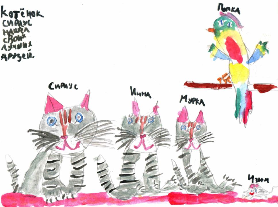 Котенок Сириус нашел своих друзей. Их зовут попугай Попка, мышонок Изюм, кошечки Инна и Мурка. Они любят проводить время вместе, играя в настольные игры. Еще они очень любят пирожки.
