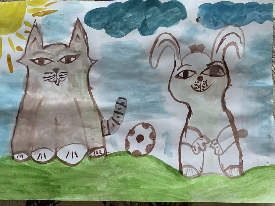 Котёнок Сириус и заяц Котька любят играть в футбол на свежем воздухе.