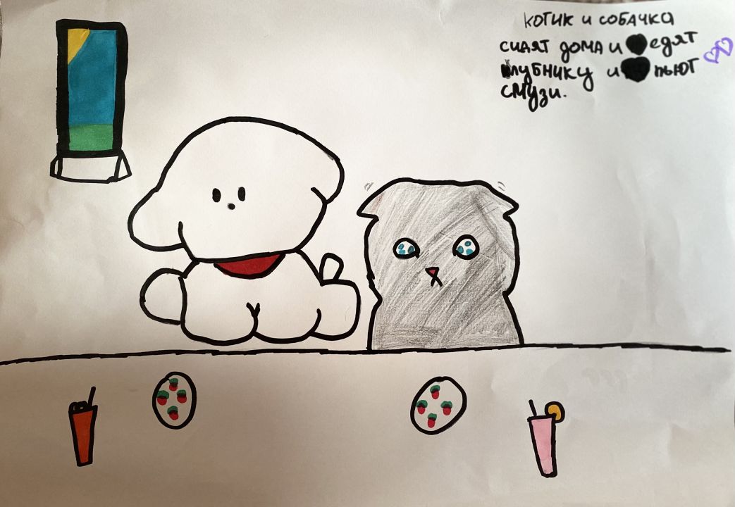 Котик и собачка сидят дома. Едят клубнику и пьют смузи.