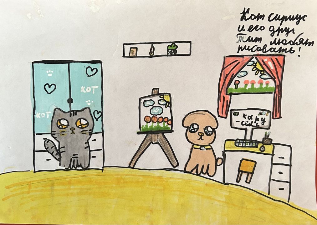 На моем рисунке изображены кот Сириус и его друг Тит. Они дружны и любят рисовать вместе.