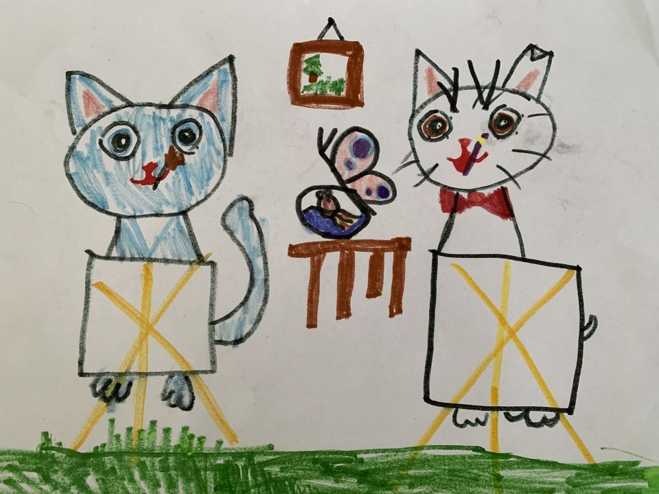 На рисунке изображен котёнок Сириус и его друг-щенок по имени Дружок. В свободное время, приятели очень любят рисовать. Они рисуют, все, что захотят. Сегодня они нарисовали аквариум с рыбкой и бабочку