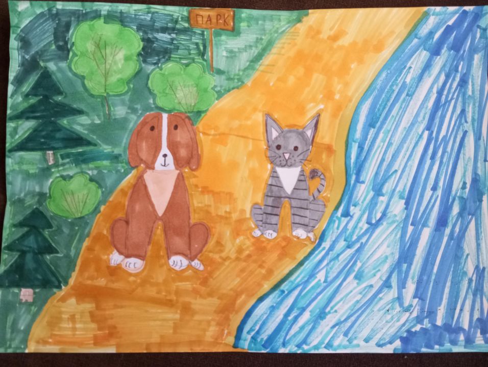 Я очень люблю собак, поэтому постаралась изобразить друга Сириуса - собака Зефа. Она такая же добрая и веселая, как Сириус. Тёплым летним днем они вместе гуляют в Парке и резвятся!
