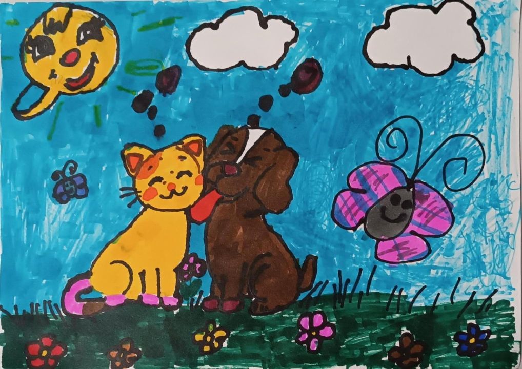 Это Сириус и его друг. Они играют на полянке и каждый думают, что они поймают самую самую большую бабочку из десяти больших бабочек. У друзей крепкая дружба.