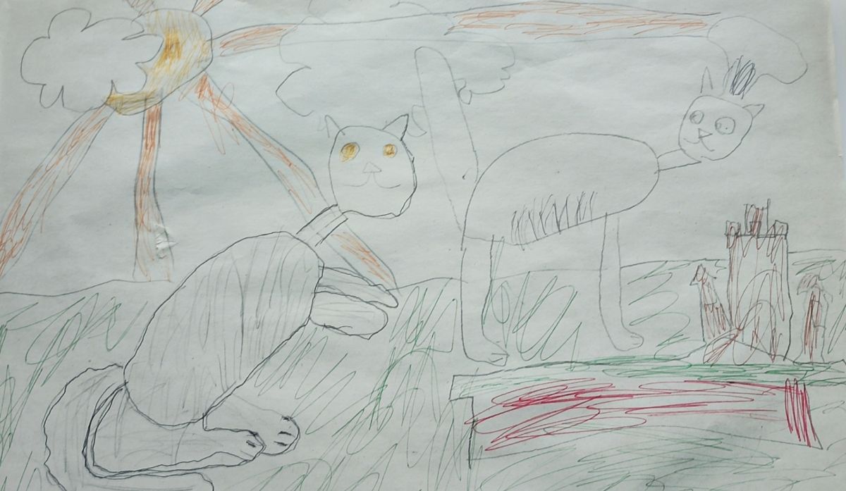 Кот Сириус играет со своим другом и строит песочный замок. Сириусу очень нравится замок, хотя он еще не готов.
