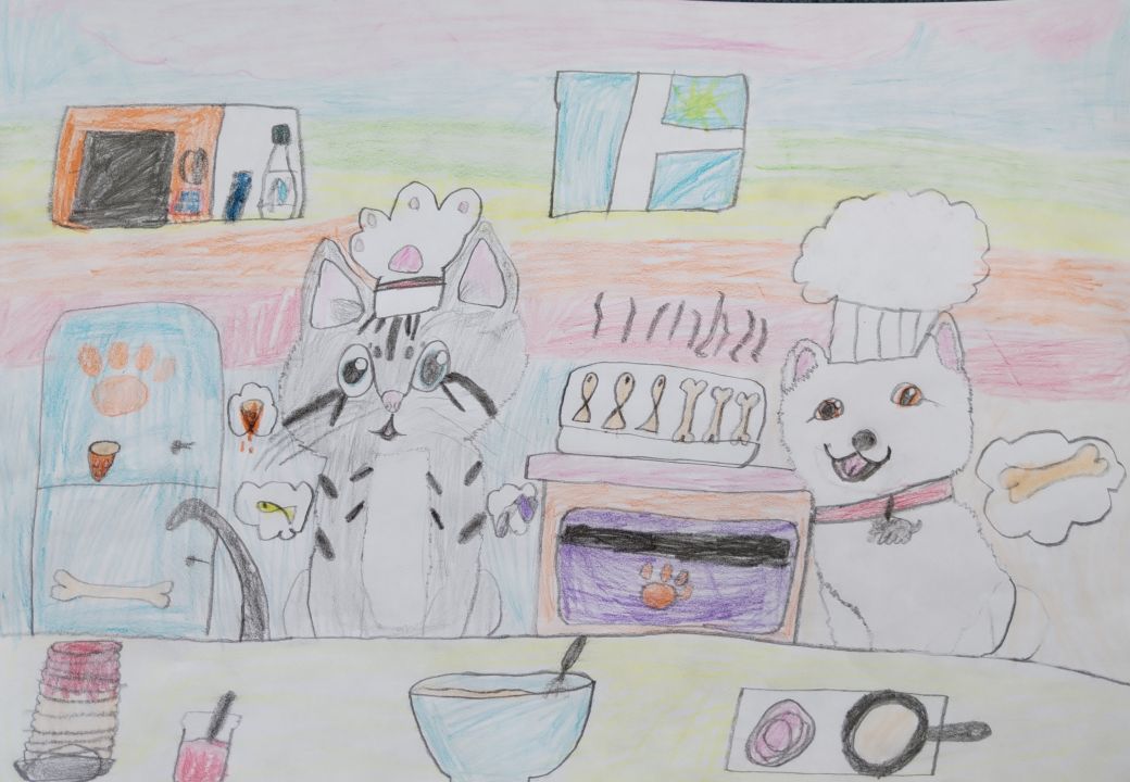 Котёнок Сириус и его пушистый друг готовят вместе блинчики.