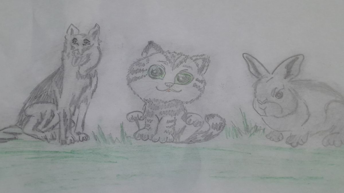 Котик Сириус и его друг щенок по имени Буба и кролик по имени Пухляш. Буба любит бегать с мячиком. А Пухляш любит есть траву.