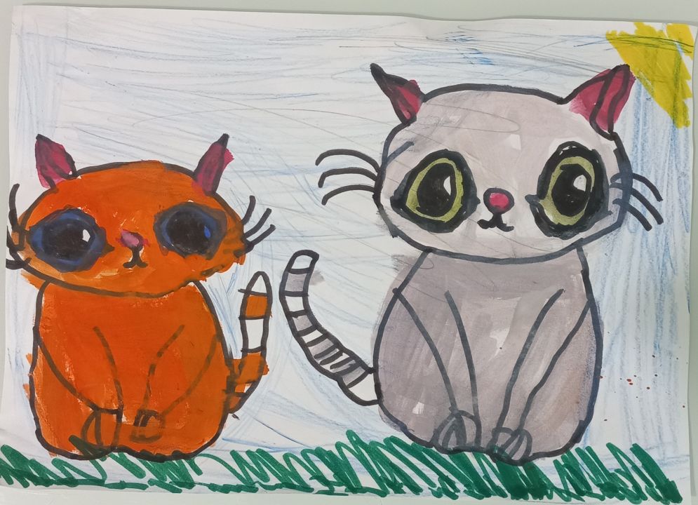 Всем привет. Я нарисовал рисунок про котёнка Сириус (серенький) и его друга Барсика. Они любят играть в футбол и просто веселиться на солнечной полянка.