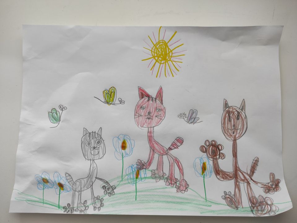 Котик Сириус и его друзья котики пошли на красивую полянку где растут цветы и летают стрекозы.