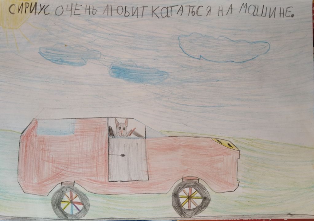 Это кот Сириус, он любит кататься на своей новой машине. И сегодня решил поехать в гости к своим друзьям.